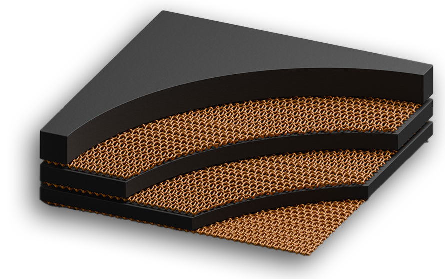 The carcass consists of either 2 or 3 plies plus low friction (low power consumption) polyester fabric slider-ply.